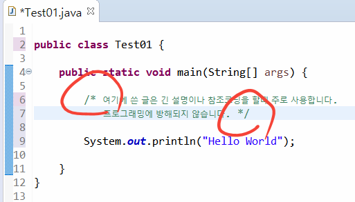 /*으로 시작을 하며 */로 끝을 짓습니다.