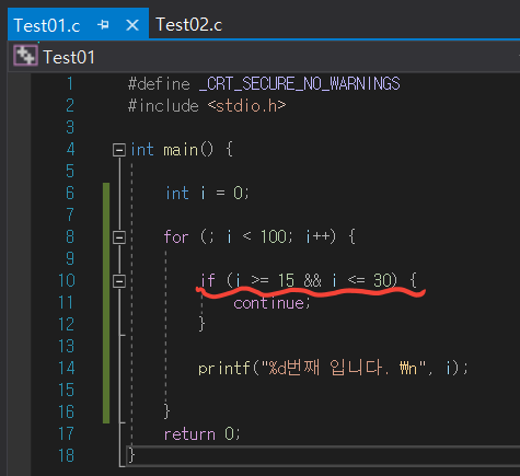 for문으로 반복을 진행하면서 15부터 30까지는 반복을 중지하고 그 후로 다시 반복문이 실행됩니다.