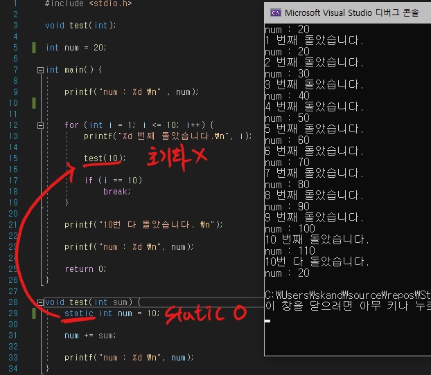 - static을 선언하지 않은 변수는 원래 선언의 값으로 계속 초기화를 하지만 static을 선언한 변수는 코드가 모두 실행되어 종료될 때가지 초기화를 하지 않습니다.