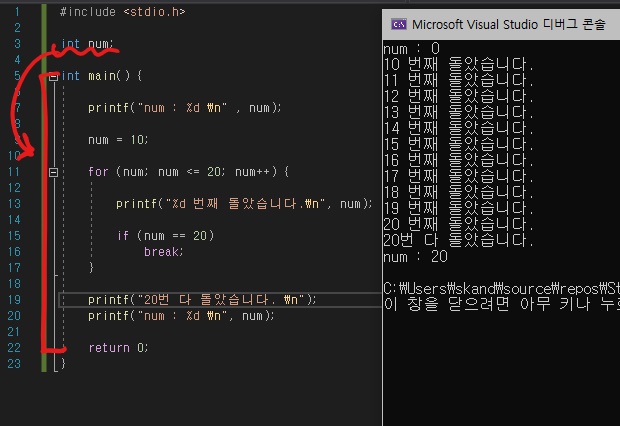 - mina 안에서 num의 값을 10으로 지정하고 if 에서는 같은 num의 값을 5로 지정하여 같은 변수명임에도 불구하고 각 코드블록에서만 적용이 되었습니다.